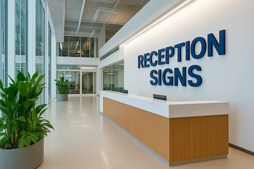 Premium three-dimensional reception signage in metal or acrylic with optional illumination, creating an impactful brand presence in corporate lobbies and reception areas.